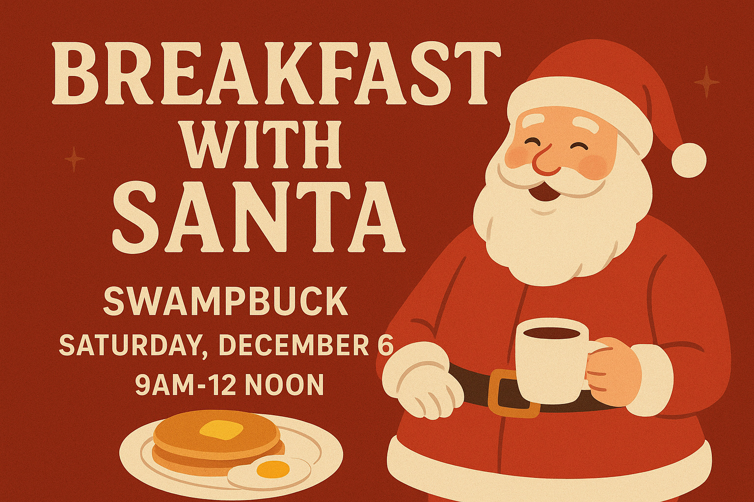 Join us for a fun-filled morning at Swamp Buck! Enjoy a delicious breakfast buffet and some quality time with the one and only Santa Claus! Breakfast will be served from 9–12 (noon) for just $XX per person.Images